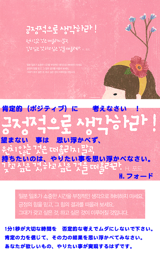 2012年 韓国卓上カレンダー(いつも晴れ)カレンダーで韓国語学習?! 「いつも晴れ」カレンダーに書かれている 名言の訳をご紹介します。 毎週(毎月)分を更新していく予定です! 参考にしてみてくださいね。 2月 3週目(2月20日〜2月26日) 遅く始める ことを恐れずに、 途中で中断することを 恐れなさい。 中国の俗談 ![]() 3週目(2月13日〜2月19日) 人生には 幾多の苦難があるが それを解決する方法は 愛しかない。 トルストイ ![]() 2週目(2月6日〜2月12日)&Monthly 2月 真の勇気は 恐れを知らないことだ。 ガンジー ![]() 1週目(1月30日〜2月5日) & Monthly 3月 肯定的(ポジティブ)に 考えなさい! 望まない事(物)は 思い浮かべず、 持ちたいの(持ちたい事)は、やりたい事を思い浮かべなさい。 H.フォード ![]() その他の月の訳を見る 1月 2月 3月 4月 5月 6月 7月 8月 9月 10月 11月 12月 ![]()
