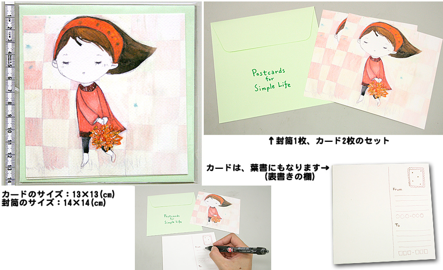 大き目なカード&封筒のセットです。カードはポストカードになっています。 カードサイズ:13×13cm、 セット内容:カード2枚+封筒1枚 画像をクリックすると、拡大できます。 |