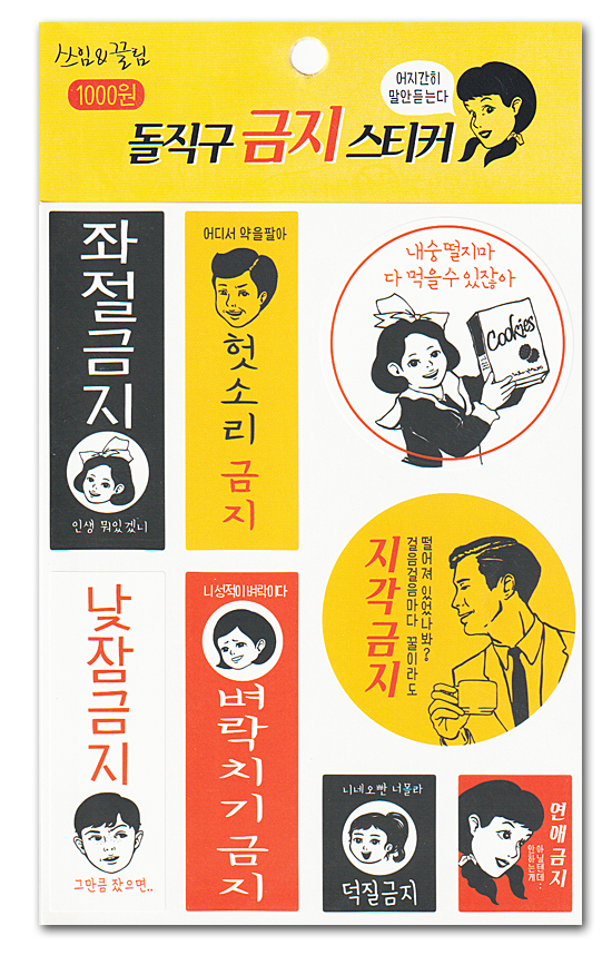 禁止の一言が書いてある、韓国語(ハングル)のステッカーです! 「よそ見禁止」や「挫折禁止」など、色々な禁止のフレーズが面白い! 大き目なステッカーで、結構インパクトがあります! 筆箱やダイアリー、壁など、どこでも貼って、自分に喝!