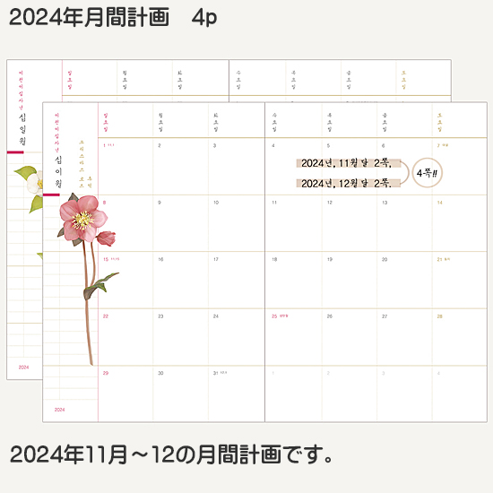 花をテーマにした韓国の2025年のダイアリーです。 月や曜日など、すべてがハングル表記になっています。 所々にデザインされた、美しい誕生花や花言葉が、 とっても可愛いダイアリーです。